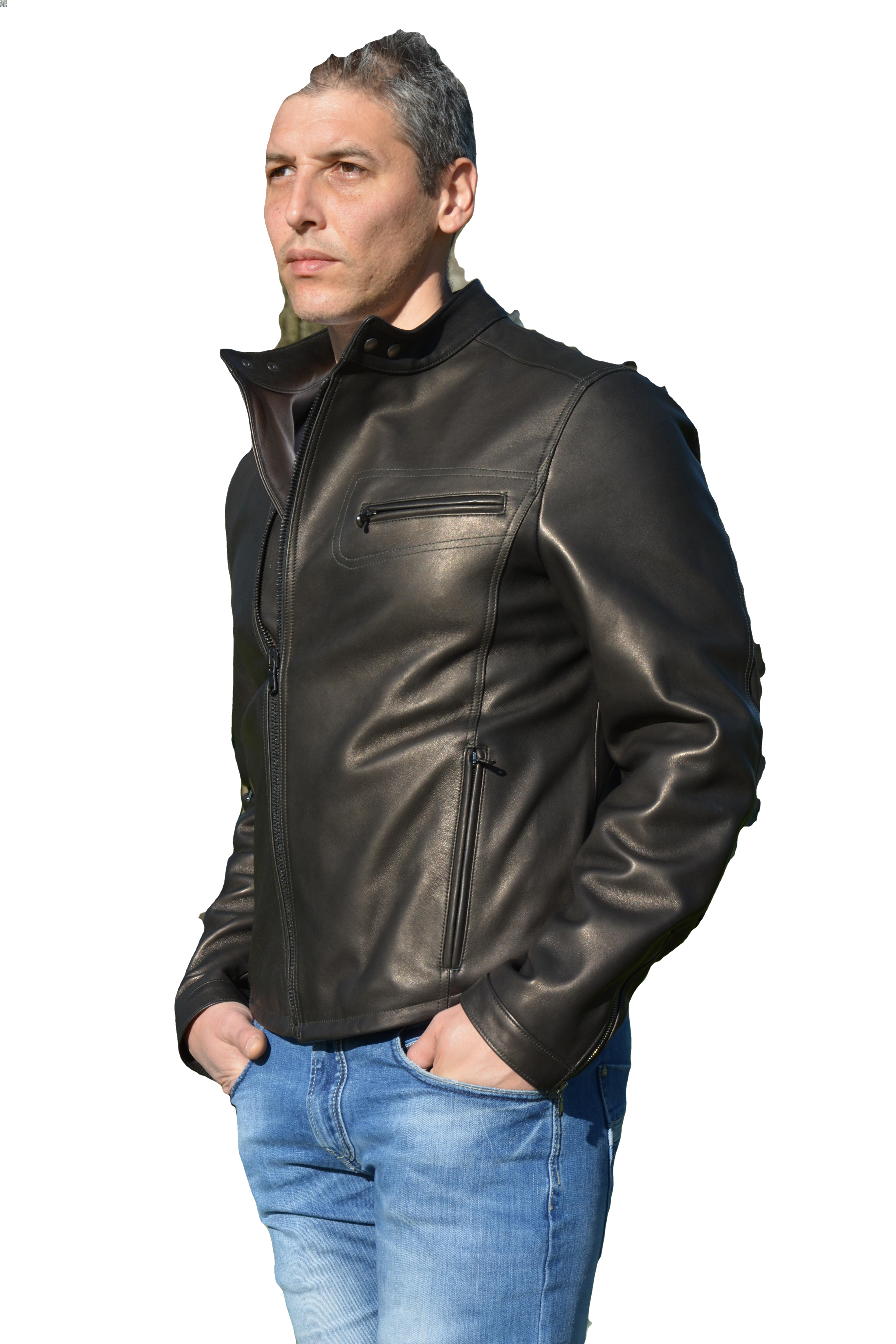 Giubbino uomo mod Biker in nappa color Marrone, foderato e con taschino interno. Due tasche laterali con zip a vista. Maniche con zip ai polsi. Allacciatura tramite zip . Produzione italiana di alta qualità. Disponibile nei colori NERO TESTA DI MORO BLU ed altri su rischiesta.